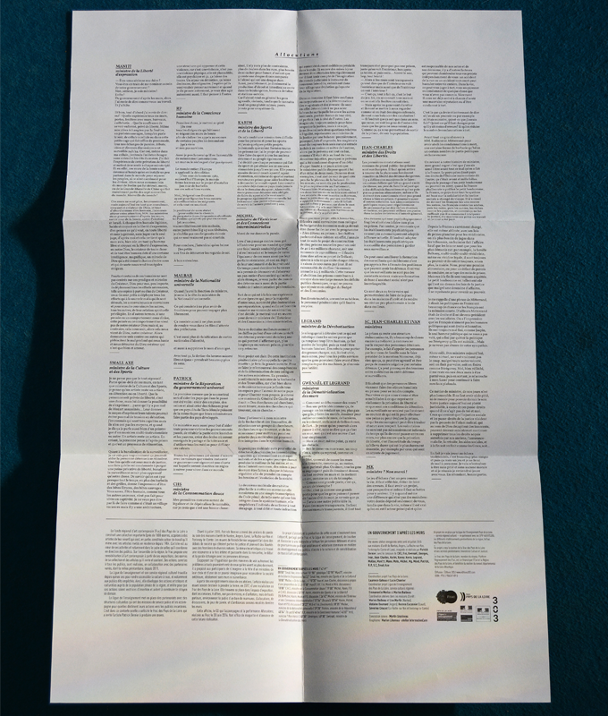 Cette « fiction-réalité » a donné lieu à la constitution d’un gouvernement composé de ministères inédits où des débats et déjà des premières mesures ont pris forme. De ces enregistrements, Patrick Bernier en a extrait une matière pour réaliser une œuvre orale et collective.